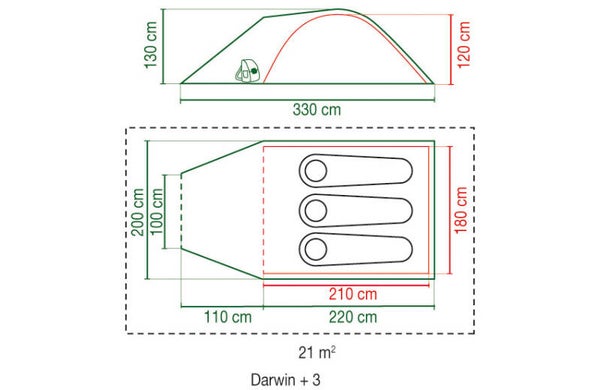 Kleur van het product: Groen, Gewicht: 4,9 kg, Waterkolom: 3000 mm, Afmeting buitentent 325 x 185 x 130 cm, Afmeting binnentent: 210 x 180 x 120 cm, Stahoogte: 120 cm, Materiaal tentdoek: 100% polyester met PU-coating, brandvertragend, Materiaal binnentent: 100% ademend polyester, Grondzeil: Polyetheen, Tentstokken: Glasvezel, Garantie2 jaar.